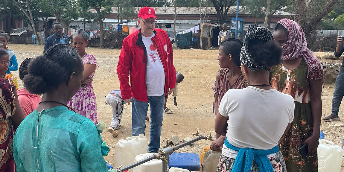Welche dramatischen Auswirkungen Konflikte, wie derzeit der Krieg im Iran, auf bereits bestehende Krisen im Globalen Süden hat, zeigt sich aktuell im Norden von Äthiopien. Zehntausende, die in der Tigray-Region vor dem mittlerweile beendeten Bürgerkrieg fliehen mussten und in eigens geschaffenen Camps Schutz fanden, sind derzeit von der Wasserversorgung abgeschnitten. Grund ist die extreme Kraftstoffknappheit in der Region. „Bedingt durch den Iran-Krieg mussten die Kraftstofflieferungen vollständig eingestellt werden, nachdem zuvor bereits ein starker, anhaltender Rückgang von 12–15 Millionen Litern pro Monat auf nur noch 850.000 Liter zu verzeichnen war“, schildert Wolfgang Wedan, Globaler Nothilfekoordinator von Jugend Eine Welt. „Das hat verheerende Folgen: Auf offiziellem Wege ist kein Treibstoff mehr zu bekommen. Unsere Tank-LKWs, die sonst regelmäßig Wasser liefern, stehen still und kommen nicht mehr in die Camps. Die Menschen haben somit kein sauberes Trinkwasser, von den hygienischen Auswirkungen möchte ich gar nicht sprechen.“ Laut Wedan sind Benzin und Diesel in der Tigray-Region aktuell – wenn überhaupt - nur noch auf dem Schwarzmarkt zu bekommen. „Die Preise sind verrückt. Berichten zufolge kostet ein 10-Liter-Kanister 45 Euro.“